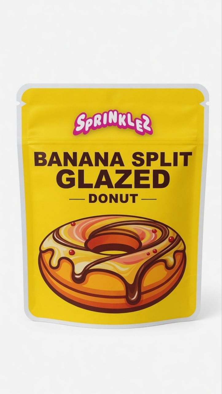 Banana Split Glazed Donut combines ripe banana flavor, glazed donut sweetness, and premium quality. In addition, it represents the rich and dessert-inspired side of the Sprinklez brand.